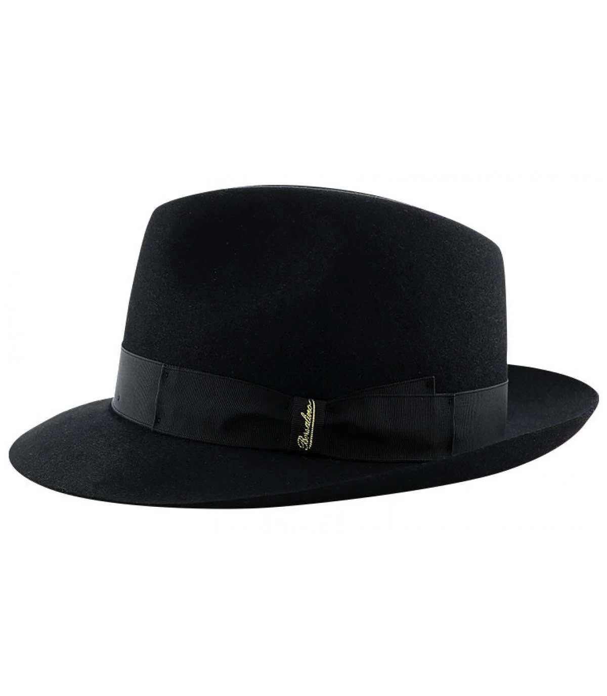 Chapeau Borsalino en feutre poils de lapin noir. Chapeau petit bord, à porter relevé ou tombant à l’avant pour un style 100% Borsalino. Chapeau ultra fin et léger, au touché doux. Galon gros-grain assorti avec impression Borsalino doré sur le côté.