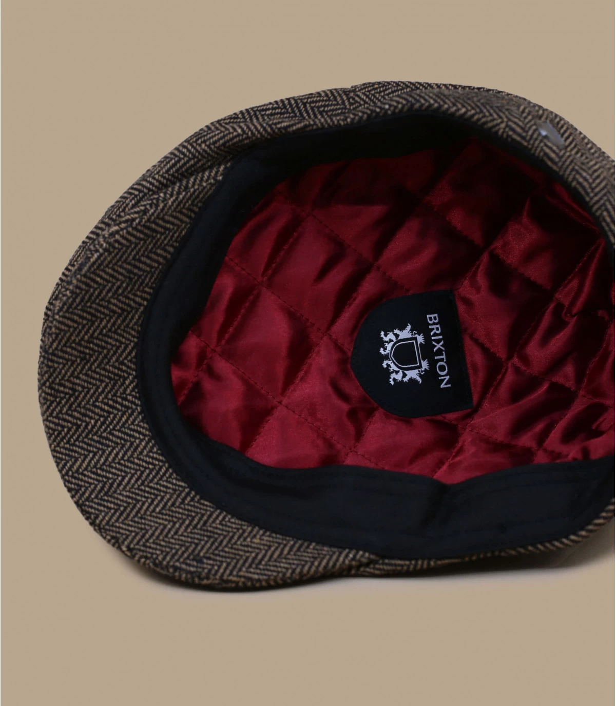 Béret casquette Hooligan pour femme avec visière. Motifs chevrons gris et khaki. Visière cousue à l’ensemble. Logo Brixton cousu sur l’arrière. Doublure 100% polyester de couleur rouge.