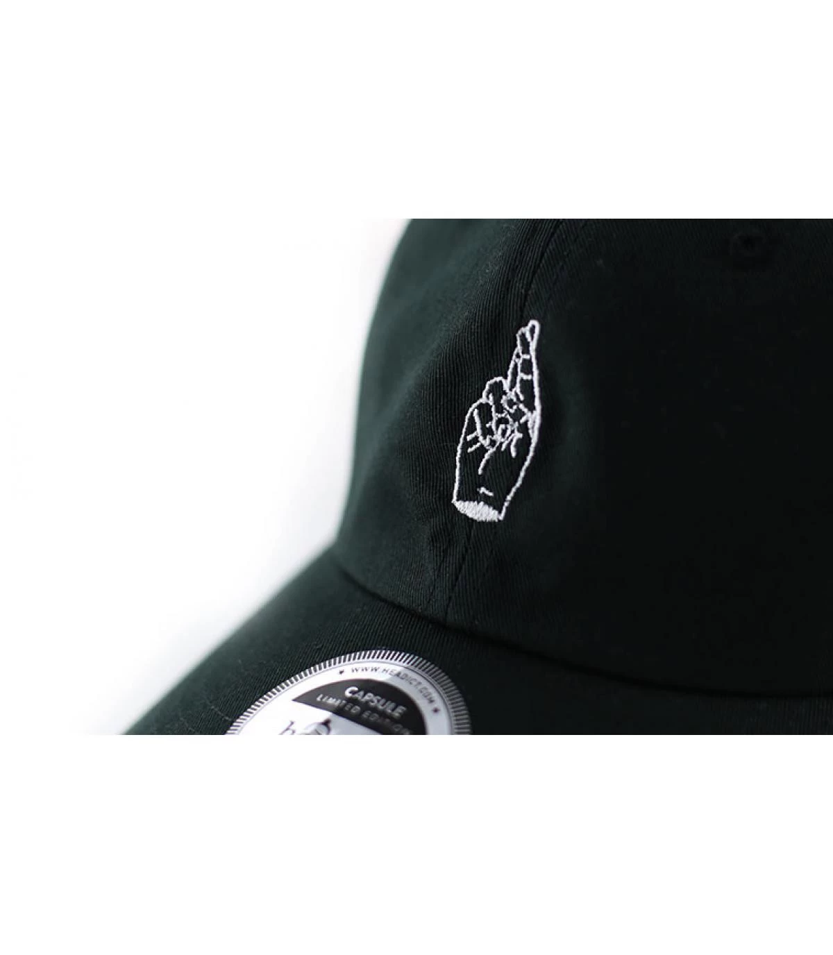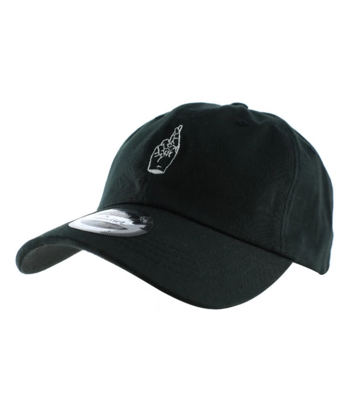 Invoquez la chance, ou conjurez votre mensonge en croisant les doigts dans votre dos. Ce symbole puissant est mis en valeur sur une casquette à visière courbée noire dans le cadre de la collab’ exclusive entre Headict et l’artiste Morte.