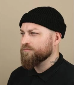 Bonnet docker de couleur noir couvrant uniquement le haut des oreilles. Matière mi polyester recyclé mi acrylique. Taille unique : 55-60 cm de tour de tête.