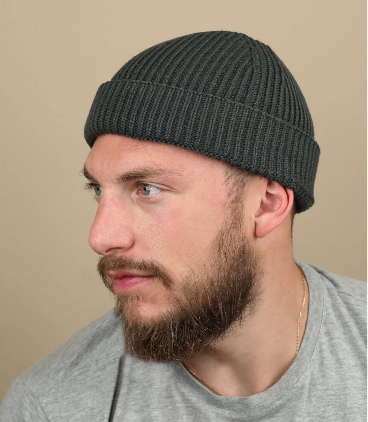 Bonnet docker de couleur gris foncé couvrant uniquement le haut des oreilles. Matière mi polyester recyclé mi acrylique. Taille unique : 55-60 cm de tour de tête.