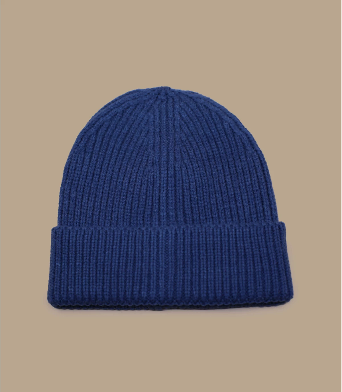 Bonnet revers en maille acrylique de couleur bleu acier. Taille unique : 55-60 cm de tour de tête.