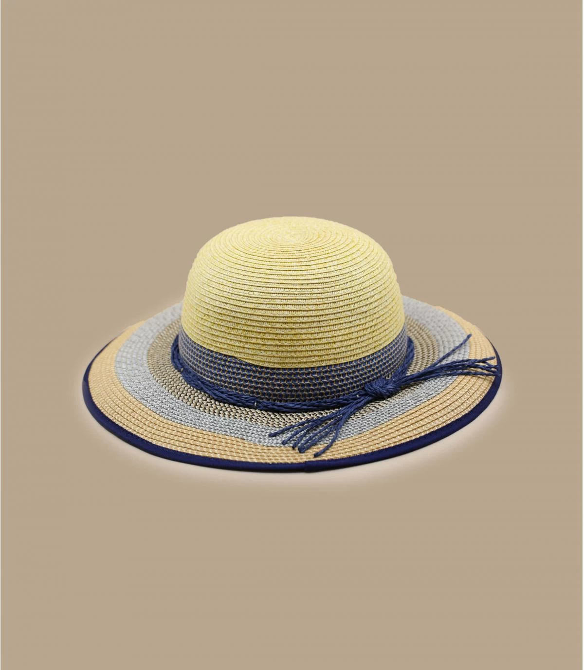 À mi-chemin entre la capeline et le chapeau cloche, ce ravissant chapeau de paille que nous propose le spécialiste Fiebig possède un large bord tombant qui vous protège très bien le front du soleil. Il est décoré de rayures grises sur fond beige et d’un joli lien noué assorti.