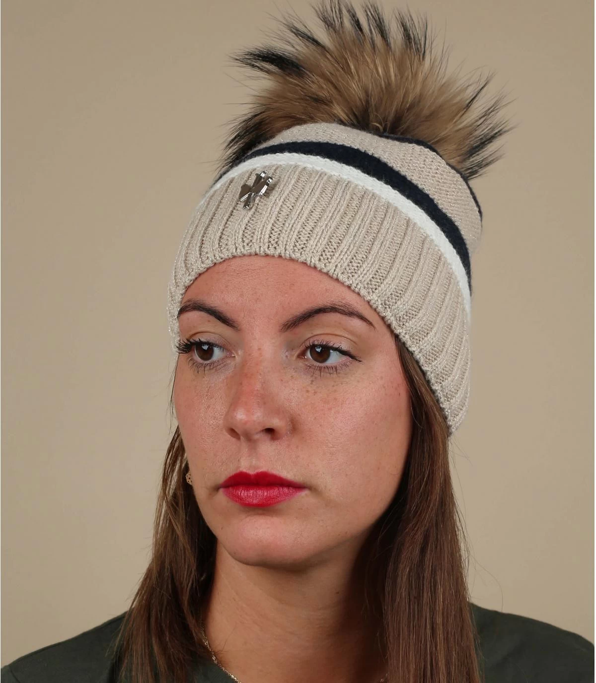 Vivez un hiver glamour, avec ce magnifique bonnet à pompon dans des tons beiges de la marque française Pipolaki. Il est décoré d’un jeu de rayures avec une insertion de fil métallisé qui lui procure un effet scintillant discret et d’un gros pompon en fausse fourrure assorti.