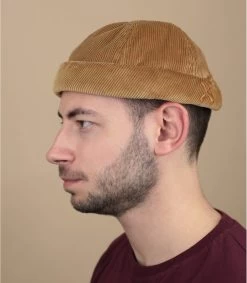 Portez un bonnet iconique librement inspiré du miki breton ! Ce modèle est superbe avec son velours de couleur beige, et son attache à l’arrière en cuir. Il porte sur le côté le logo de rames croisées de la marque française.