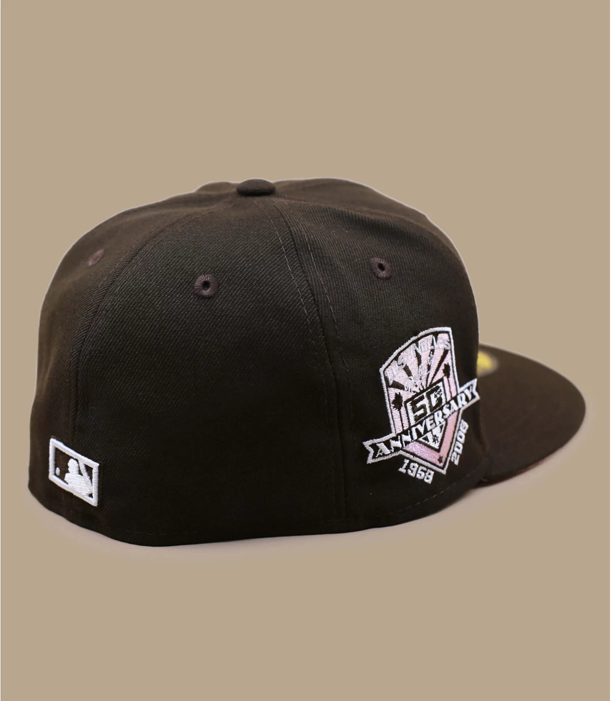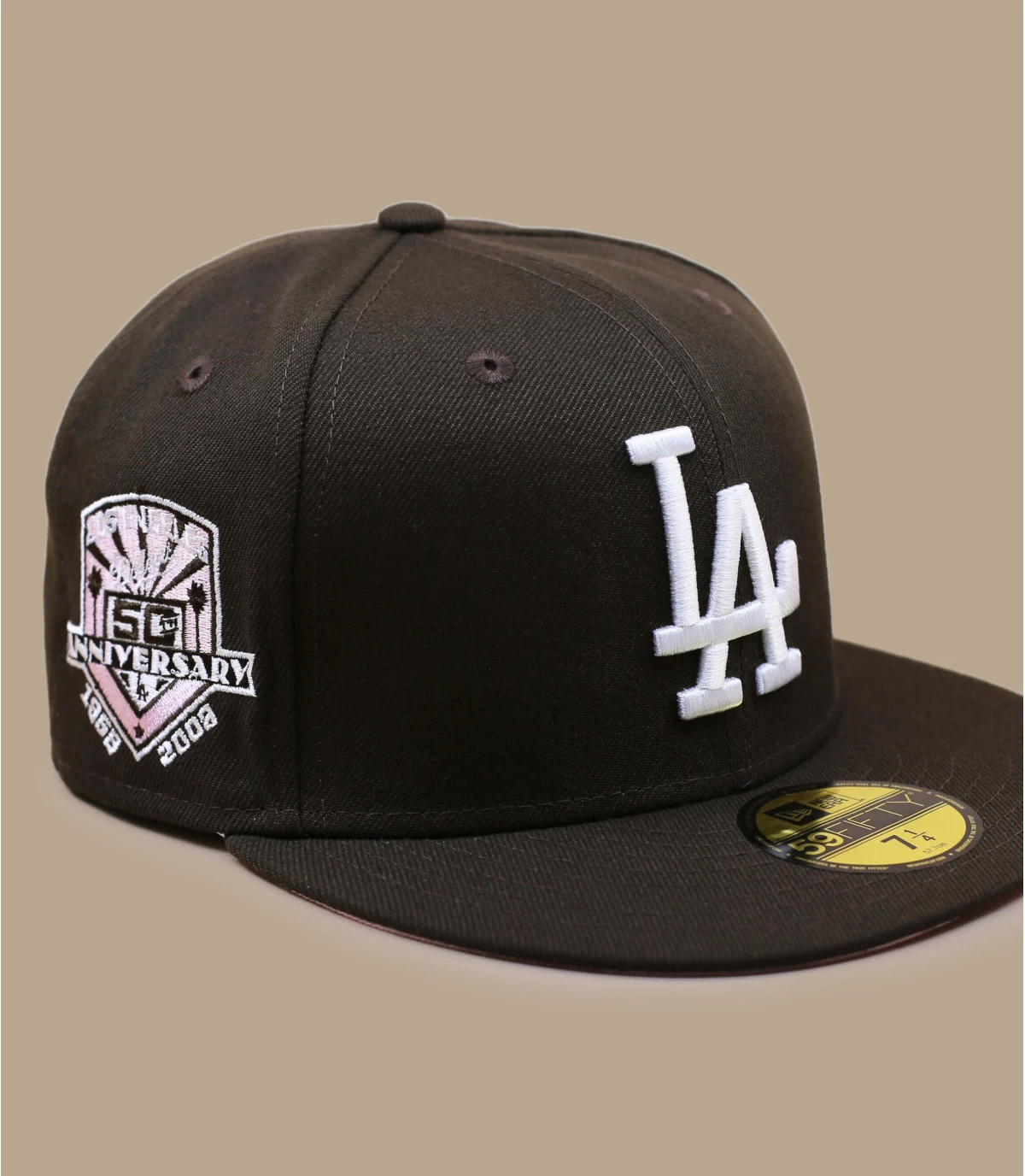Les Dodgers de Los Angeles sont une franchise de renommée dont la réputation les précède ! Les initiales LA brodées en blanc sur cette casquette 5950 marron feront un maximum d’effet. Le dessous de la visière est rose pâle.
