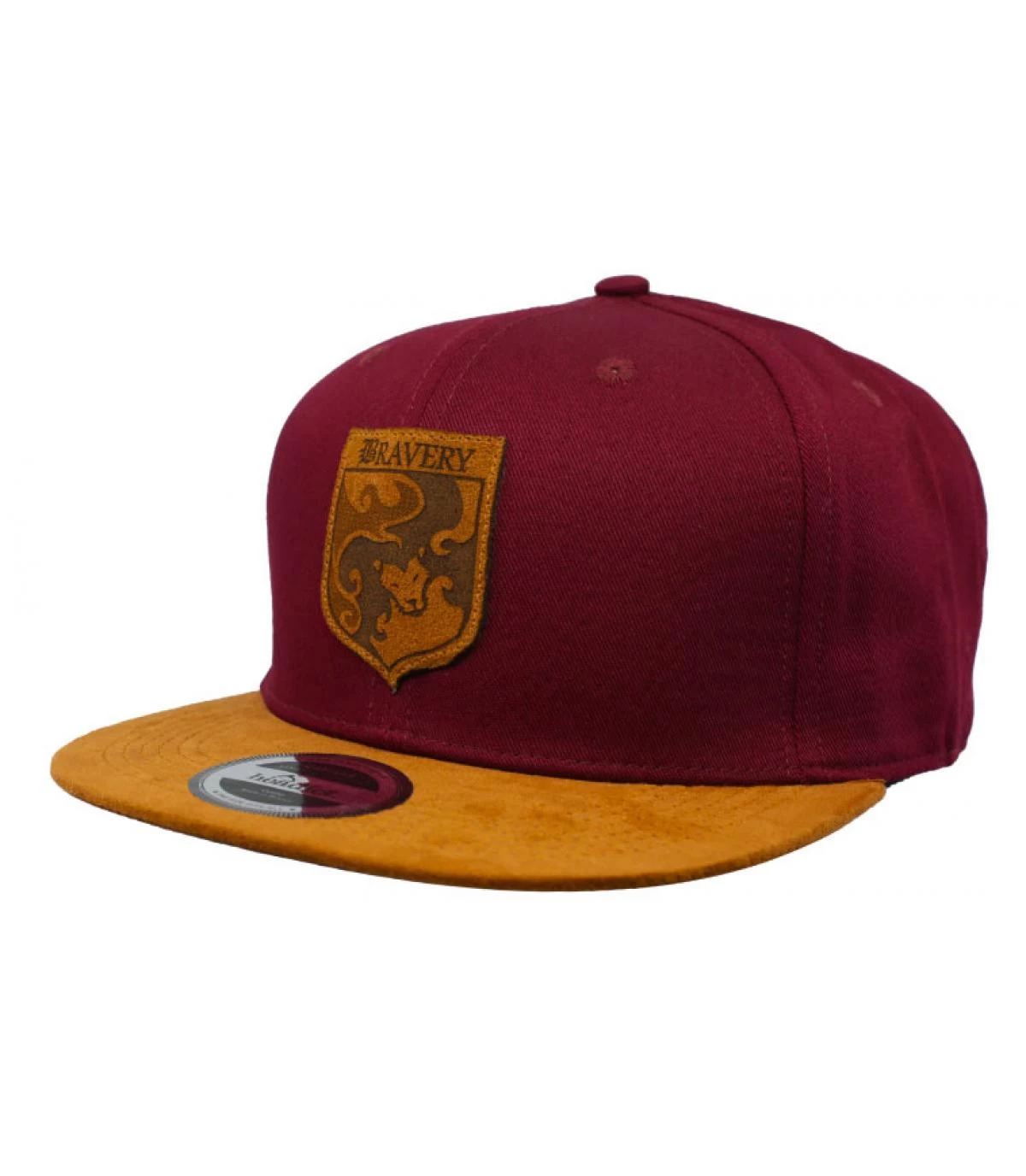 Sentez-vous le courage de faire face aux plus grands défis de la sorcellerie, avec cette snapback bordeaux à visière en cuir suédé, décorée d’un magnifique patch en cuir gravé assorti. Celui-ci affiche un écusson de lion et la mention BRAVERY, bravoure.