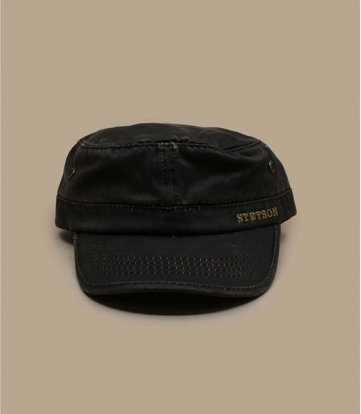 Casquette army marron de la marque US Stetson. Œillets métal, broderie Stetson à l’avant.
