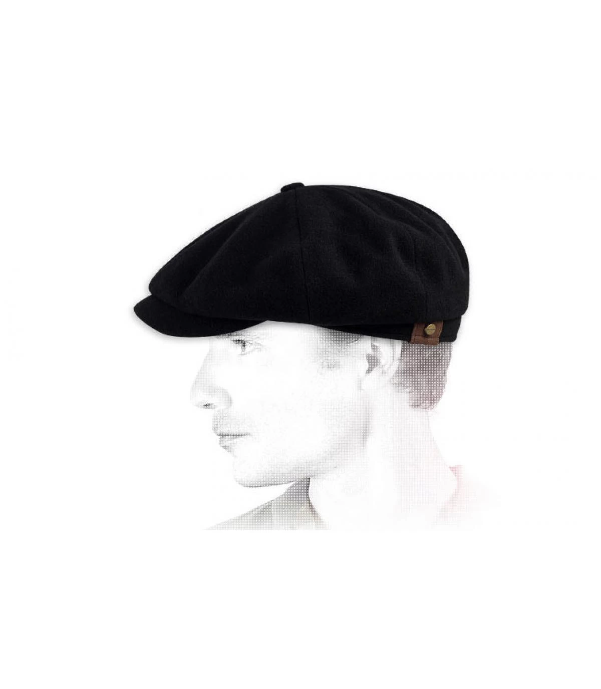 Casquette plate Hatteras noire en cashmere et laine. Avec visière courbée cousue à l’ensemble sur le dessus. Logo Stetson aposé sur l’arrière.