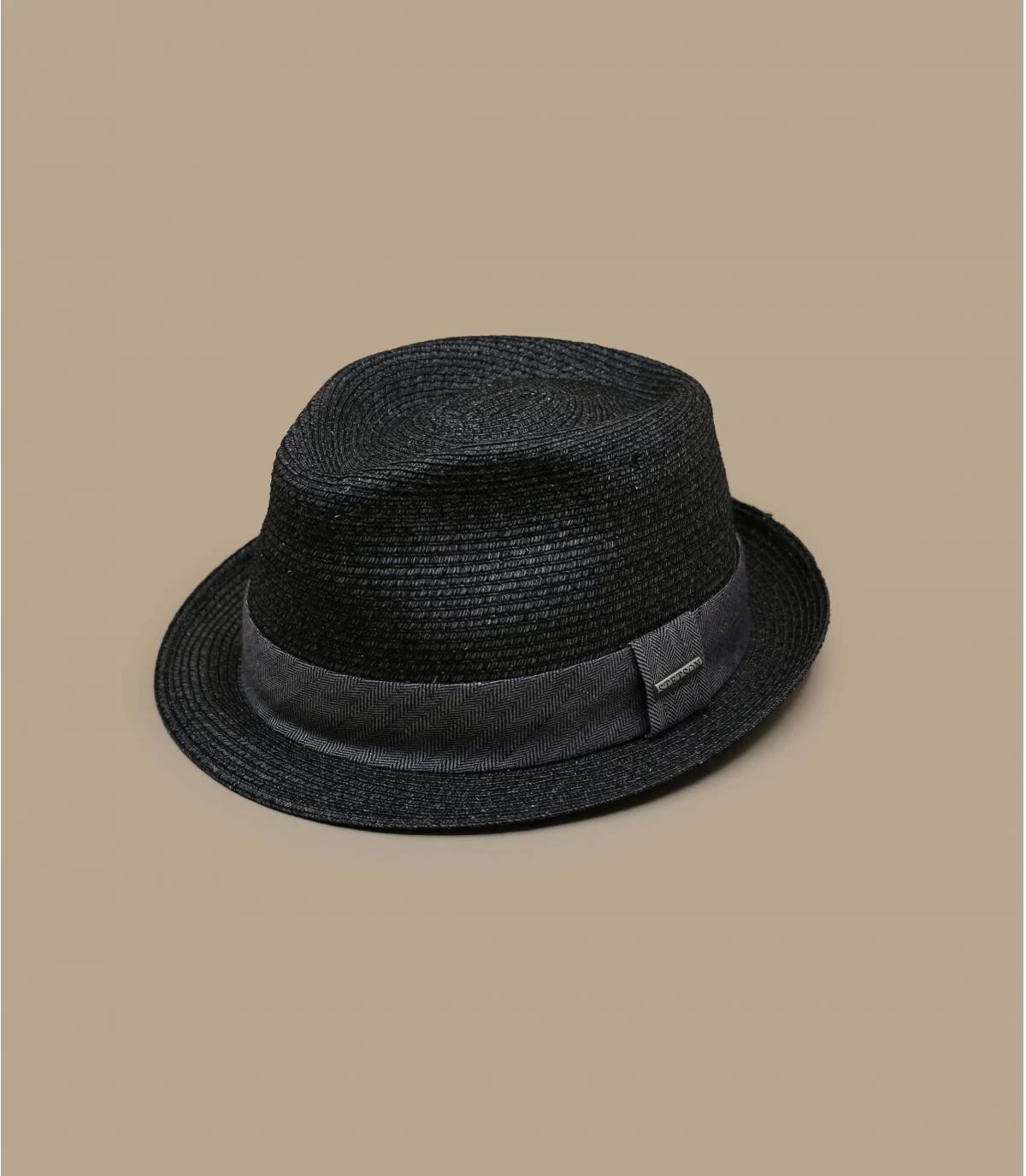 Chapeau gris anthracite. Une bande en tissu gris clair fait le tour de la base. Logo en métal Stetson fixé sur le côté de ce chapeau trilby. Chapeau livré dans son coffret Stetson.