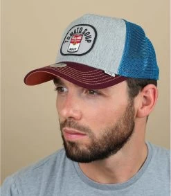 Affichez une allure American vintage, avec cette superbe casquette trucker grise, bleu et bordeaux, décorée devant d’un magnifique patch brodé représentant une canette de la fameuse Campbells Tomato Soup, reprise par Warhol dans ses célèbres peintures pop.